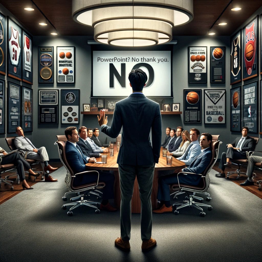 I’m talking to my younger self, not you, about doing this damn PowerPoint. (You’re doing great.) There I was, sitting in a conference room at NBA headquarters in Manhattan. This was early in my career at my first big corporate job. I was overwhelmed, having come fresh from a magazine job where I got to interview star athletes and write about it. That was pretty much it. No corporate bureaucracy.